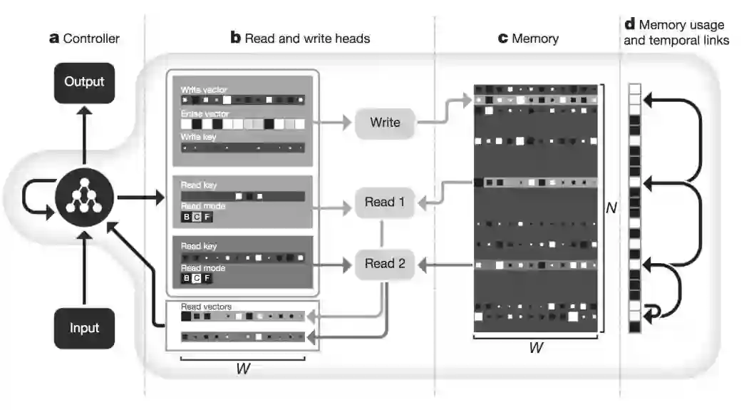 时间连接(Temporal Linkages):关于记忆写入顺序的相关信息。它能允许控制器推理数据之间的关系,因为时间连接在算法中是很常用的。
