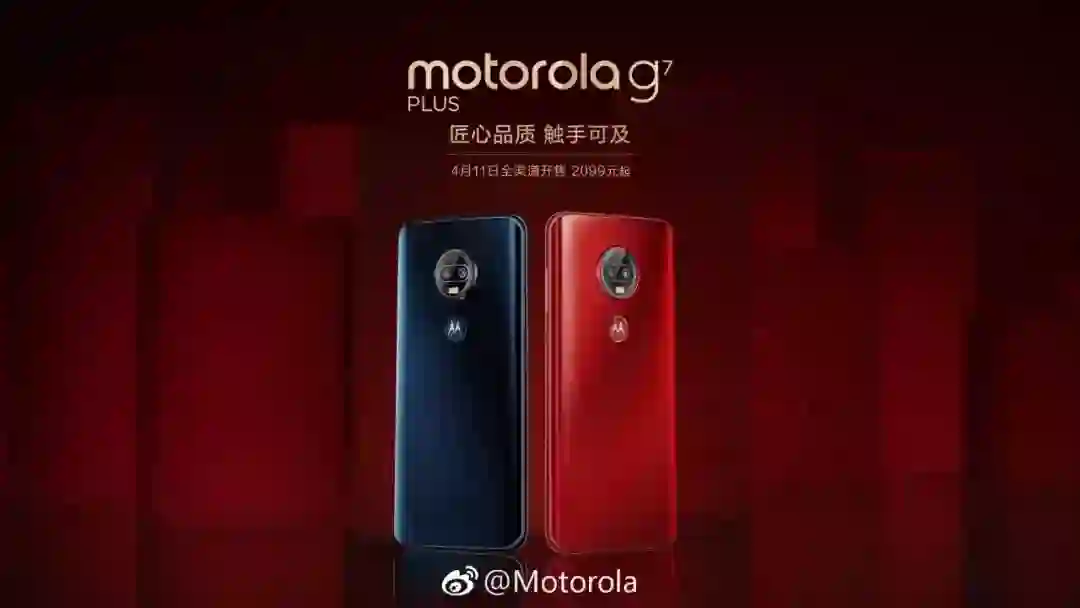 4 月 9 日,摩托罗拉正式发布国行版 g7 PLUS,指纹 logo 二合一设计,骁龙 636 处理器,6.24 英寸水滴屏,后置 1600+500 万双摄,前置 1200 万,3000mAh 电池,亮点是支持 Type C 接口 27W QC4.0 快充,保留 3.5mm 耳机接口,4+128 版本 2199 元,6+128 版本 2399 元,中国红和深海蓝两个配色。