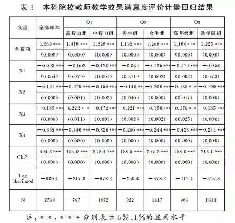 就智力分组(Q1)的回归结果看,高智力组,也就是“985”和“211”本科院校教师使用新技术手段对教学效果满意度评价的影响并不显著,而中智力组,也就是一般本科院校教师使用新技术手段对教学效果满意度评价的影响显著,这说明在授课对象不同智力水平下,新技术手段对教学效果的影响是存在差异的。