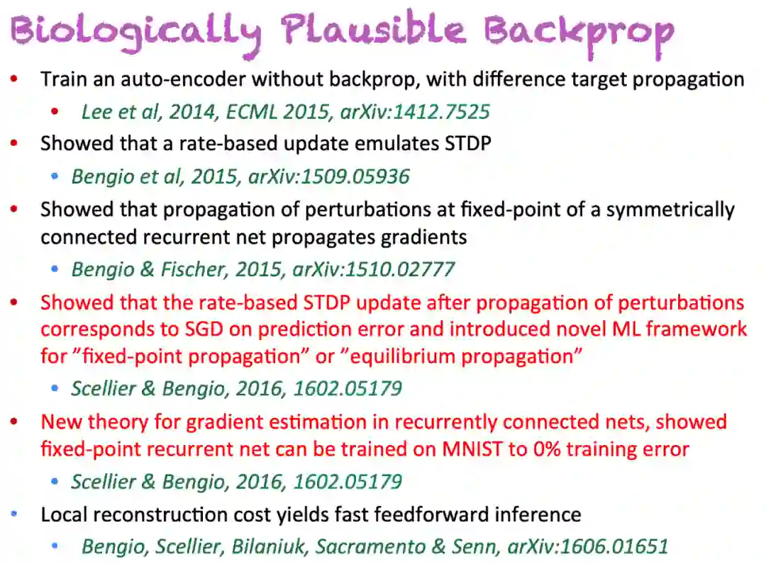 次年,在 NIPS 2016 Workshop 上,Yoshua Bengio 做了同名演讲,其中就探讨了「反向传播」机制的生物学可信性。