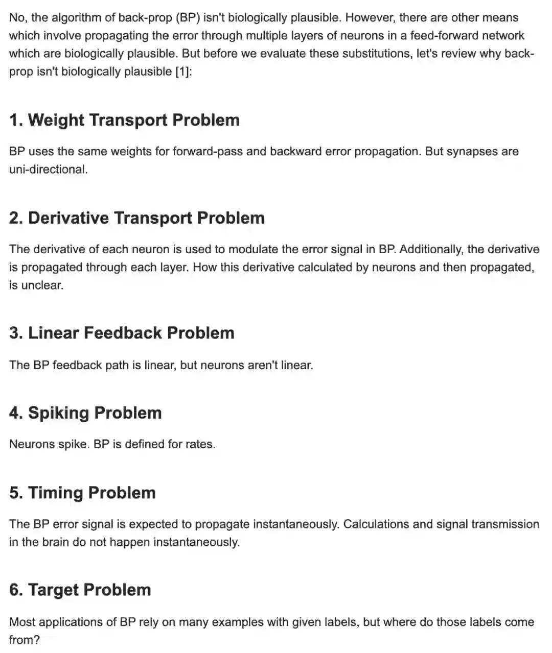 有人曾列举了反向传播并非生物学可信的诸多理由,以及提出修复办法的多种算法。