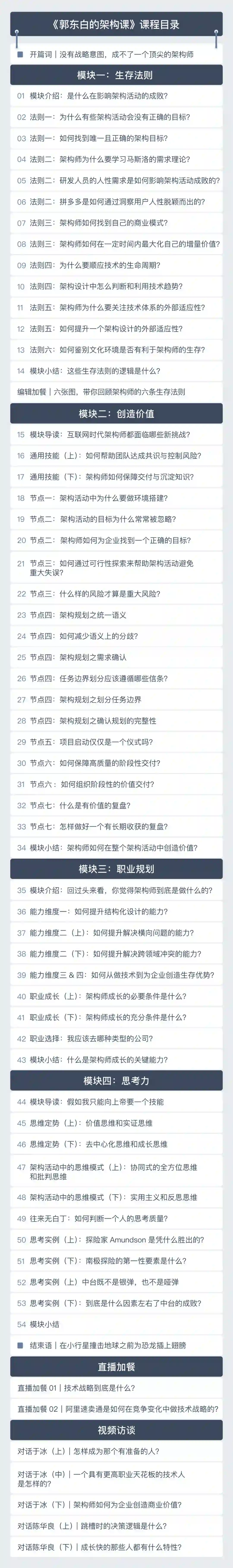 模块三:专注到你个人,帮你规划在架构师这个职业上的成长。架构师成长的每个阶段面临的挑战都不一样,要解决问题的本质也不一样, 东白会结合自己在这些角色中的经历和观察总结,提出帮助你突破障碍、完成能力跃迁的具体建议。