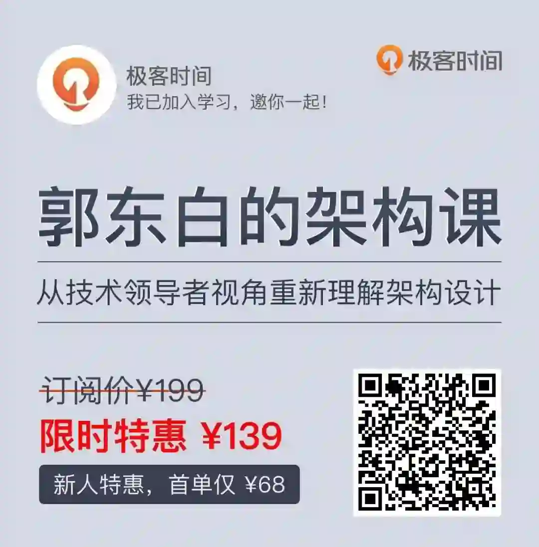 可惜我跟他没有太多交集,去年年底听说他出了个专栏《郭东白的架构课》,我第一时间就去看了,这个专栏记录了非常多他总结出来的架构方法论,包括「架构师的六大生存法则」、「架构活动实施的八个关键节点」、「架构师能力提升的五大关键能力」等,内容非常不错。