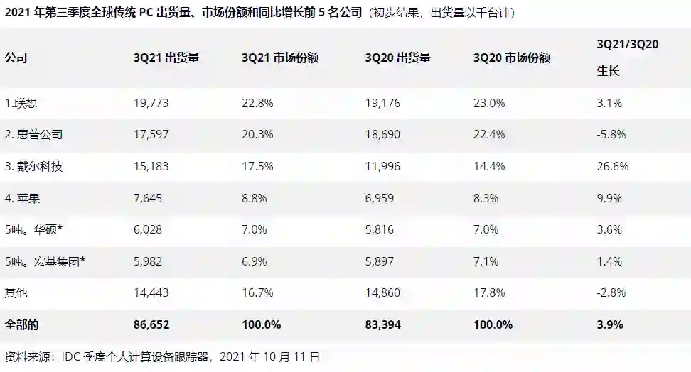 昨日,市调机构 IDC 发布最新 PC 市场调查报告,2021年 Q3 传统 PC 全球出货量达到 8670 万台,比上年增长 3.9%,这是 PC 市场连续第 6 个季度增长,不过也导致将迎来市场需求激增,组件短缺和其他供应挑战。
