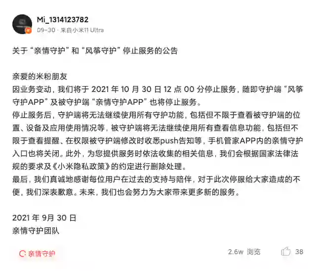 近日,小米社区发布公告,宣布将于 10 月 30 日 12 点关闭 “亲情守护” 功能,随即守护端“风筝守护 App ”及被守护端“亲情守护 App”也将停止服务。