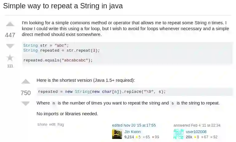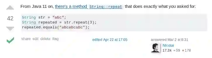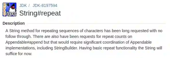 如你所见, String 现在有一个 repeat(int) 的方法。毋庸置疑,它的行为和我们理解的一模一样,完全没有可以争议的地方。