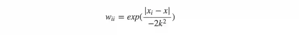 那么权重的表达式又是怎样的呢,我们需要距离给定x的样本点的权重越高,LWRL使用核来对附近的点赋予更高的权重,最常用的是高斯核函数,对应表达式如下: