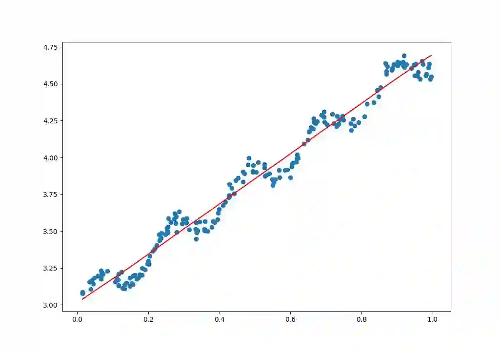 上面的数据点是通过公式y=3+1.7x+0.1sin(30x)添加噪声生成的数据,而标准的线性回归是一种无偏差估计,在计算所有点的时候都是无偏差的计算误差并通过优化方法优化误差,如果针对不同的点能够对误差进行调整便可以一定程度上避免标准线性回归带来的欠拟合现象。