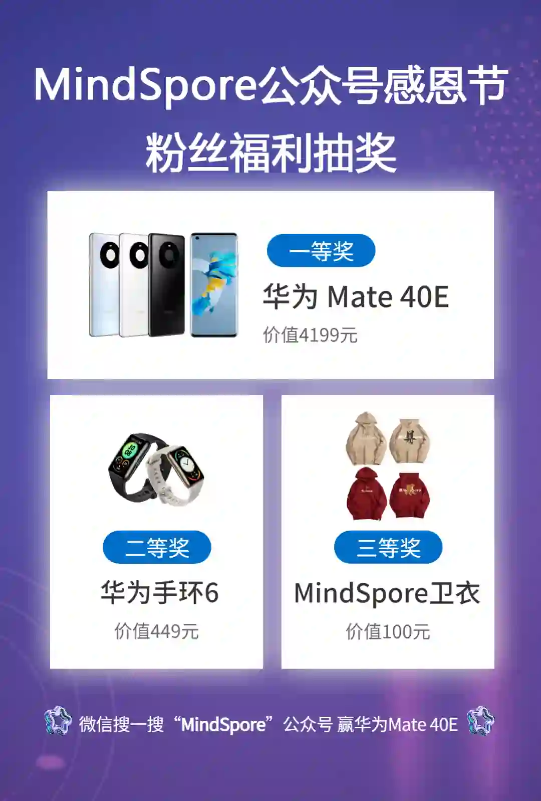 明天就是感恩节了,昇思MindSpore公众号的编辑部为全体小孢子准备了专属的感恩节福利,只要点击以下图片就能跳转抽奖哦~