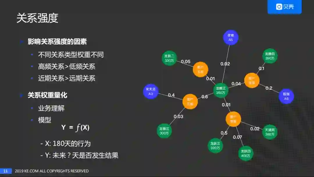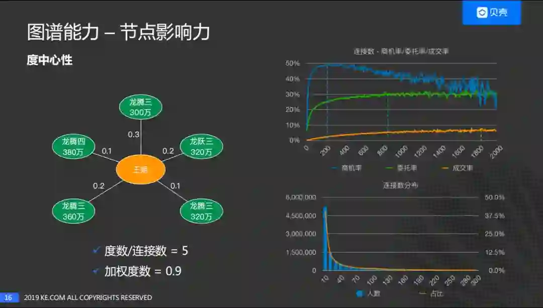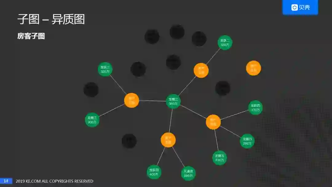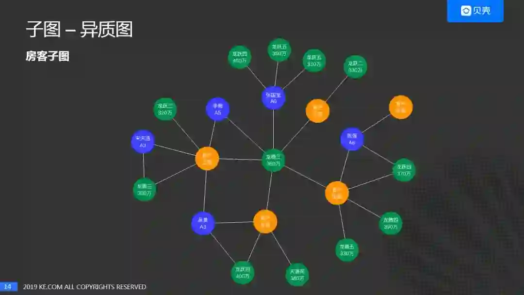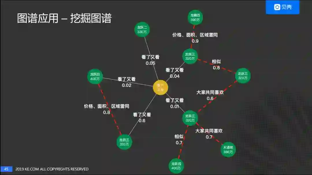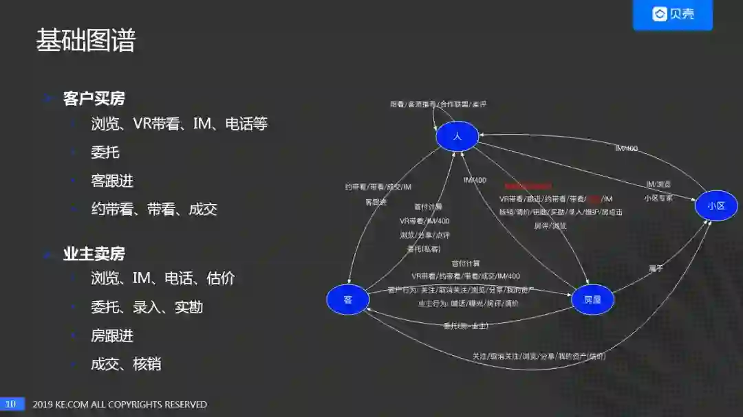 从第一行可以看出,贝壳的客户、房数量较大,每日新增也很大,经纪人增长也很快,小区相对稳定,增量不大。第二行是2019年贝壳找房房产行为数据。如何从如此庞大的数据中得到有用于决策的信息,是我们现在要做的工作。用什么方法挖掘数据背后的价值?我们想到了关系图谱。