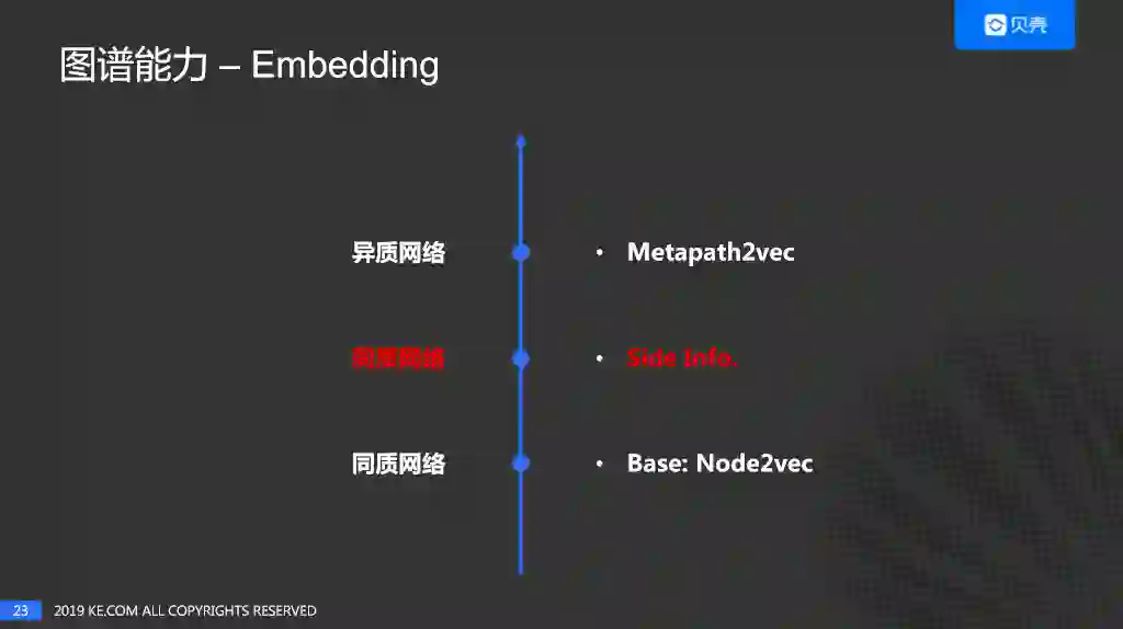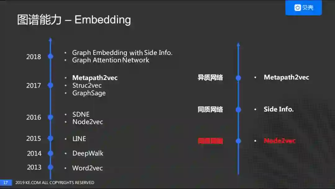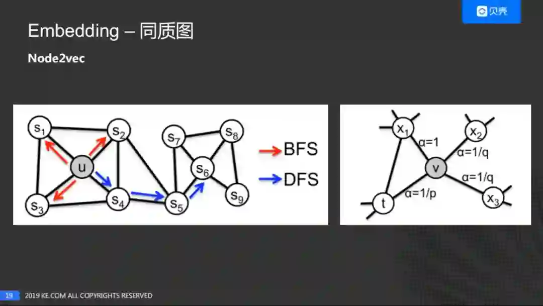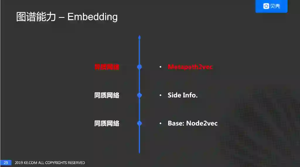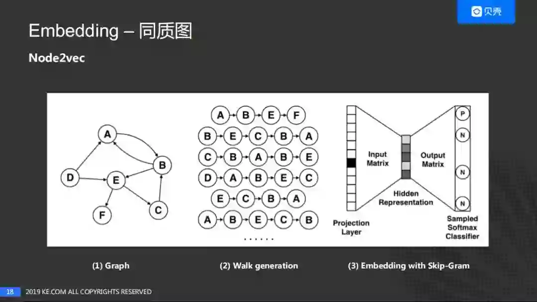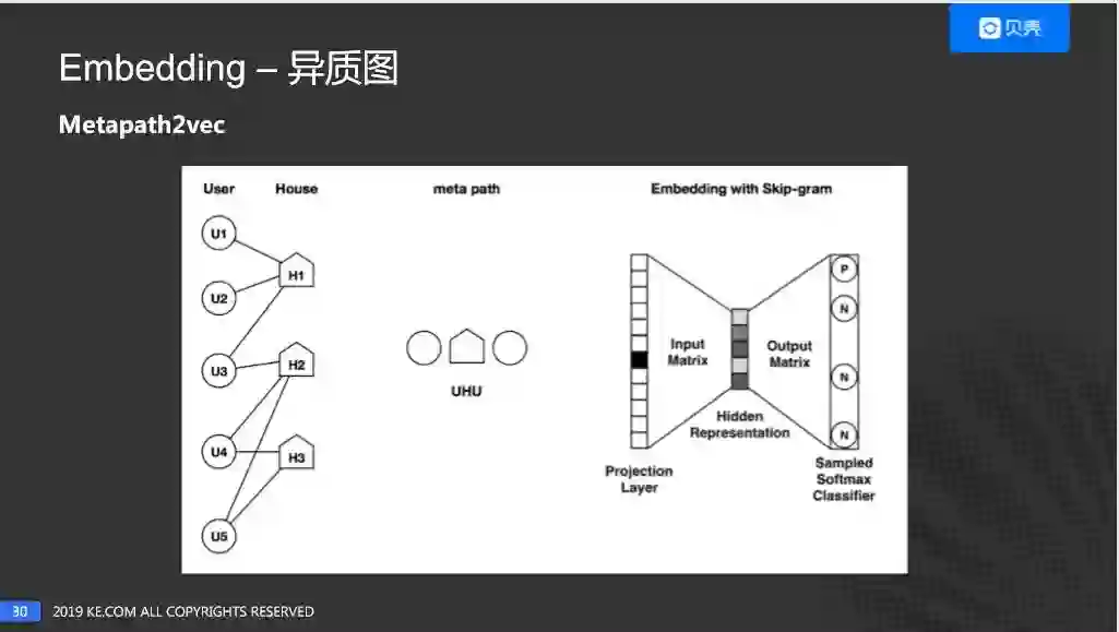 Graph Embedding近年来发展迅速,在各大公司陆续开始应用,并取得了不错的效果。结合贝壳自身的情况,对于同质图的网络采用的是Node2vec,并尝试使用Side Info来优化Node2vec;针对异质图网络尝试使用Metapath2vec。