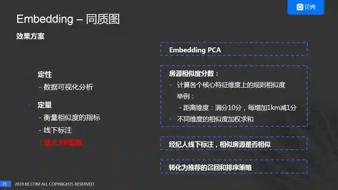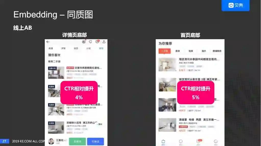 最后,我们进行了线上实验,在贝壳详情页的底部"猜你喜欢",还有首页的底部,"为你推荐"做了AB实验,在房源详情页面的底部CTR相对提升了4%,在首页底部,相对提升了5%。