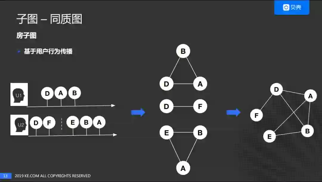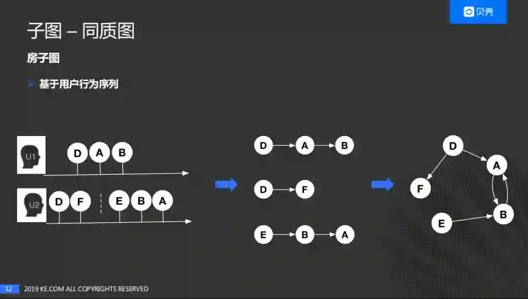 用户1先后看了DAB三个房子,用户2分两个时间段分别看了,DF及EBA房子;我们由此推断,对于用户1可以由D到A,A到B建立联系;对于用户2,第一个时间窗口D到F及E到B,B到A可以建立联系;最后进行聚合可以得到第三个图,就是房子的关系图谱。