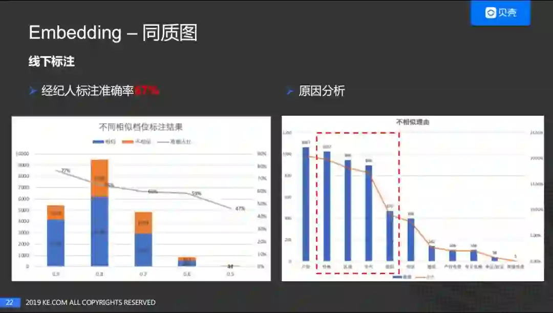 上图展示了V1版本经纪人对Node2vec线下标注的结果。我们考虑了不同种类的房子,包括高端房源、普通房源,也包括学区及远郊和市中心的房源,最终结果的准确率是67%。左图是对不同标注挡位的标注结果进行的分析,横坐标是不同相似度的挡位,柱状图蓝色表示相似的数量,橙色表示不相似的数量,折线图表示对应的准确率。我们可以看到余弦相似度越高,房源相似度越高。