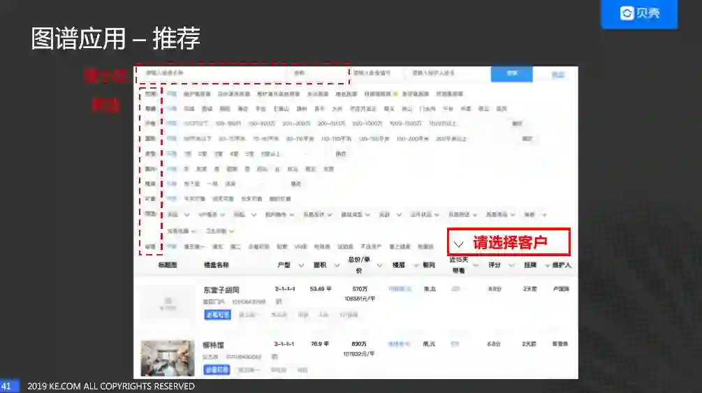 我们有了基础图谱,有了子图谱,也可以根据子图谱进行能力的建设,用在一些推荐的场景下。那么,我们能否用一种方式把所有的能力结合起来?比如,中间是客户,我们以客户为中心,基于基础图谱得到与他直接相关的房源信息,然后对相关房源信息经过图谱能力(房子图/协同过滤)进行挖掘找到相似的房源。也可以通过房子的特征找相似房源,即图中红色线段所示,就是二度关系。这样我们设想通过可视化的方法直接展示房源信息,然后把推荐变成可视化推荐的方法。我们正在通过这样的思路,设计产品。