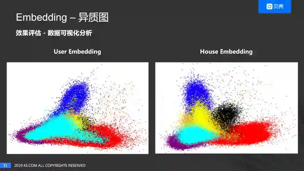 这是异质网络的 User Embedding 及 House Embedding PCA 降维后的结果。不同的颜色也代表不同的城市,我们可以看出来在不同城市也是有一定聚集度的。