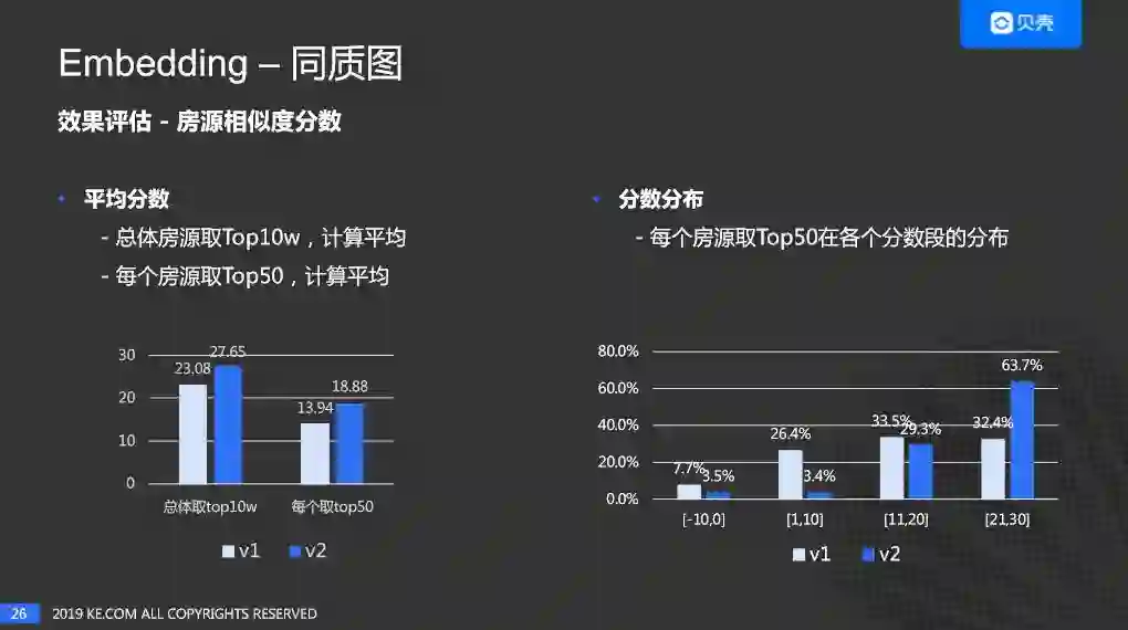 这是评估房源相似度分数的情况,左边是平均分数,从两个维度来考虑,第一个是把所有的房子两两之间计算它们的相似度,然后取Top 10W,第二个是对每套房源取Top 50。 通过左边的图表,我们可以看出V2的效果要明显好于V1。右边的图是分数的分布,对每个房源取Top 50,然后分析相似房源规则打分分数的分布,可以看出V2明显是分布在高分段之中。蓝色是V2 版本,浅色是V1版本。