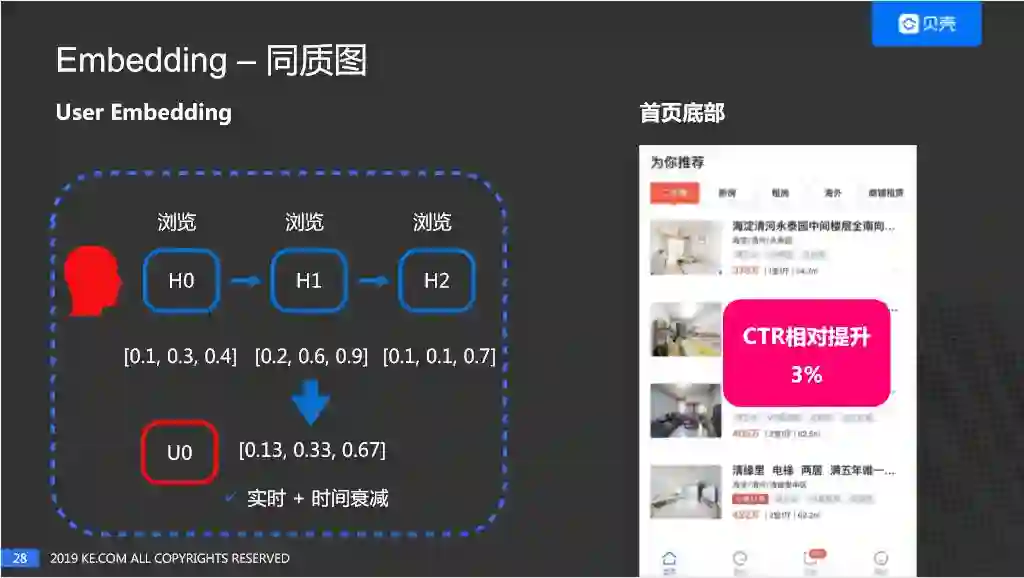 首先,用户先后浏览了三套房源,然后进行向量化,最后进行加权平均,作为用户的Embedding。在实际应用时,我们考虑了实时数据和时间衰减两个因素,最后应用在推荐,在贝壳APP首页的底部进行了AB实验,CTR 相对提升了3%。