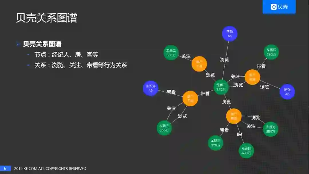 "关系图谱"在业内通常也叫"网络图谱",上图展示了贝壳关系图谱的实例。实例中,节点是:经纪人、房、客人等。关系:浏览、关注、带看等行为关系。有些是常见的行为,有些是贝壳找房独有的行为,如:带看,等。