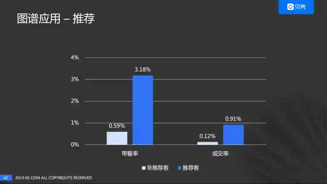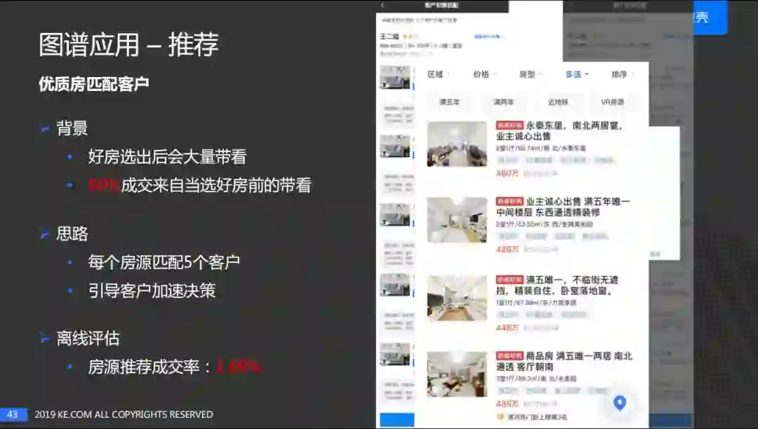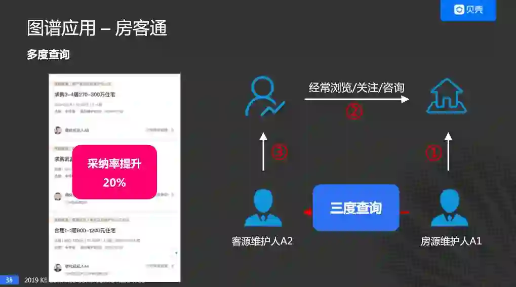 以房客通项目为例:当某个用户经常浏览关注或者咨询某个房源时,房源的维护人A1和客户的维护人A2。A1会邀请A2带着客户来带看房源,这是一个三度查询的示例。产品上线之后,采纳率提升了20%。