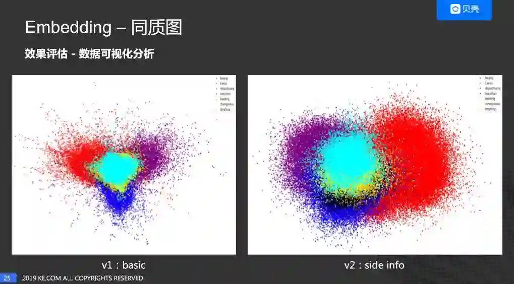 这是两个版本PCA降维之后的结果,每个颜色代表一个城市。可以看出来,Embedding在不同的城市里面是有一定的聚集度的。同时也可以看出加入了房子特征之后的V2版本,效果比V1版本好很多。