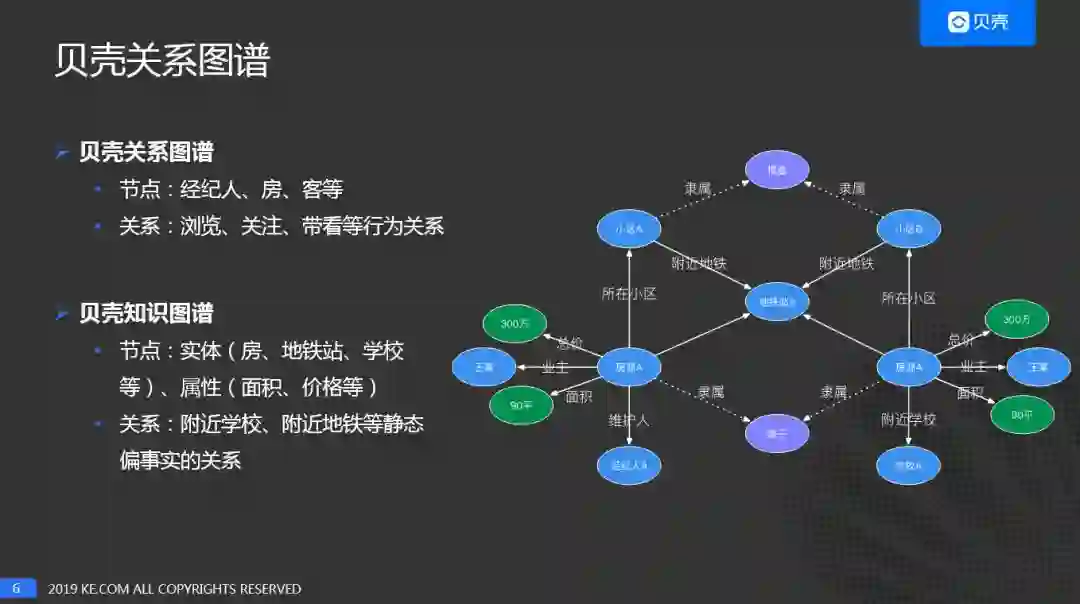 关系图谱与知识图谱的差异,首先看下贝壳知识图谱的示例,节点是:房、地铁站、学校等,关系是附近学校、附近地铁等静态的关系。关系图谱更偏向动态的行为网络而知识图谱更多的是偏实时的静态的知识网络。