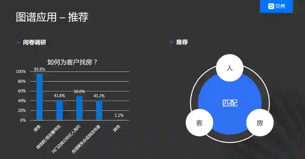 大家可能对C端的推荐比较熟悉,就不做介绍了。这里主要介绍B端的一些探索,如何助力经纪人。我们做了一个问卷调查,关于经纪人如何为客户寻找合适的房源,我们发现经纪人主要有4种方式:第一是搜索,第二是微信群或者朋友圈,第三是向门店的其他经纪人咨询,第四是房源交流会时大家相互交流。我们发现,经纪人在为客户找房的过程是比较原始的,没有好的策略及算法来支撑他们。