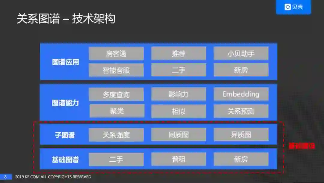 介绍完基本的关系与节点,下面来讨论一下,如何从0到1搭建关系图谱。在这个过程中离不开三个核心:关系图谱能做什么?如何设计?如何应用?下面以贝壳关系图谱的整体技术架构为切入口,为大家详细介绍下: