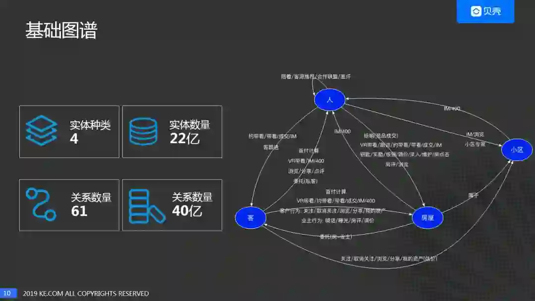 贝壳二手房关系图谱,如下图所示。有四个实体,人:经纪人,客:客户/业主,房,小区。实体数量22亿,关系数量有61种,40亿。
