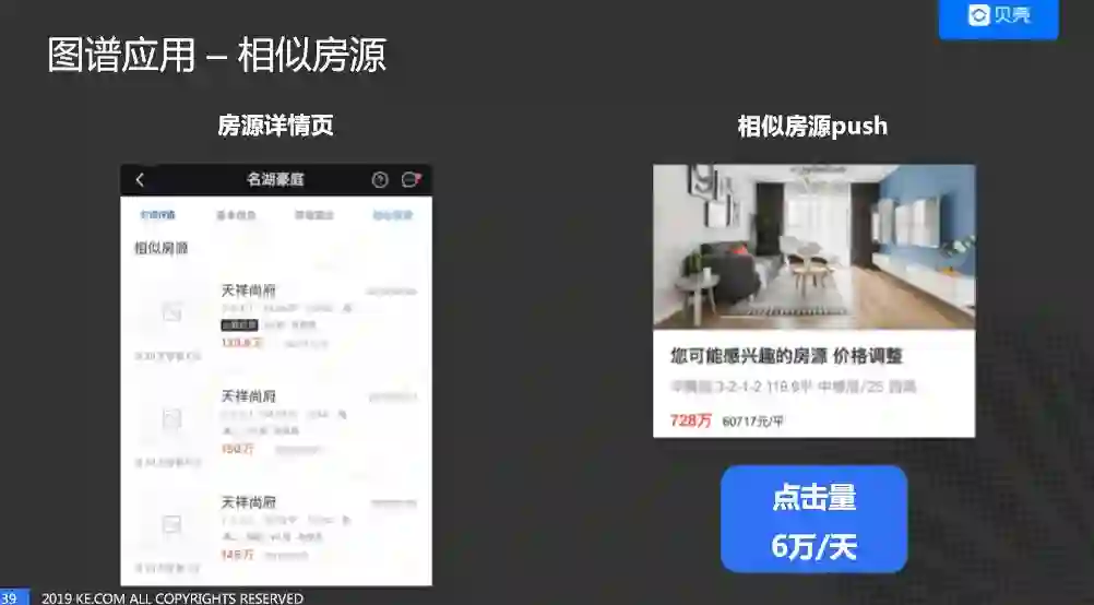 一个是房源详情页,在底部进行相似房源推荐;一个是相似房源push。其原理是当一个房子降价时,我们看经纪人关注的房源的相似房源是否是降价的这套房源,如果是,可以认为经纪人对这套降价的房源感兴趣,我们就会push一条消息给他。这个产品是近期上线的,每天的点击量是6W 左右,效果还不错,因为我们已经暴露了这套房子的核心信息,经纪人点进去,说明是比较感兴趣。