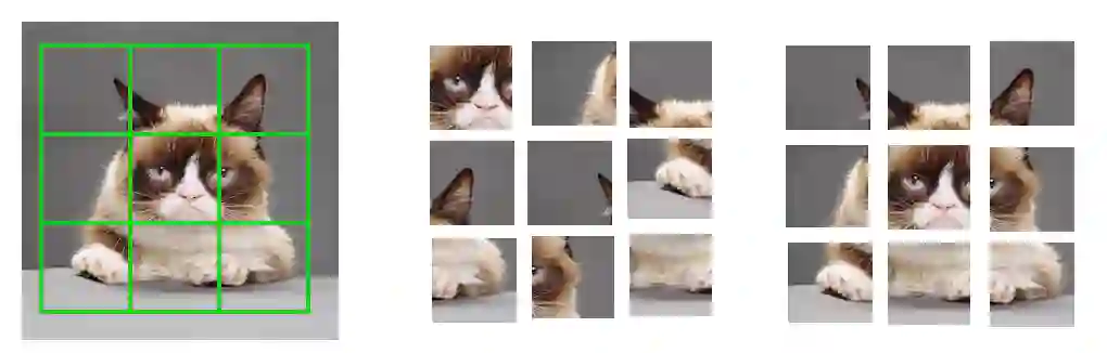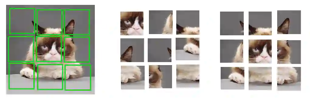 以jigsaw puzzles为例,如下图,如果我们让划分的patch之间紧密挨着,那么神经网络只需要判断patch的边缘是否具有连续性,就可以判断patch的相对位置,而不需要学到高级的物体语义信息。这就是一种捷径,我们在设计任务的过程中需要避免这样的捷径。