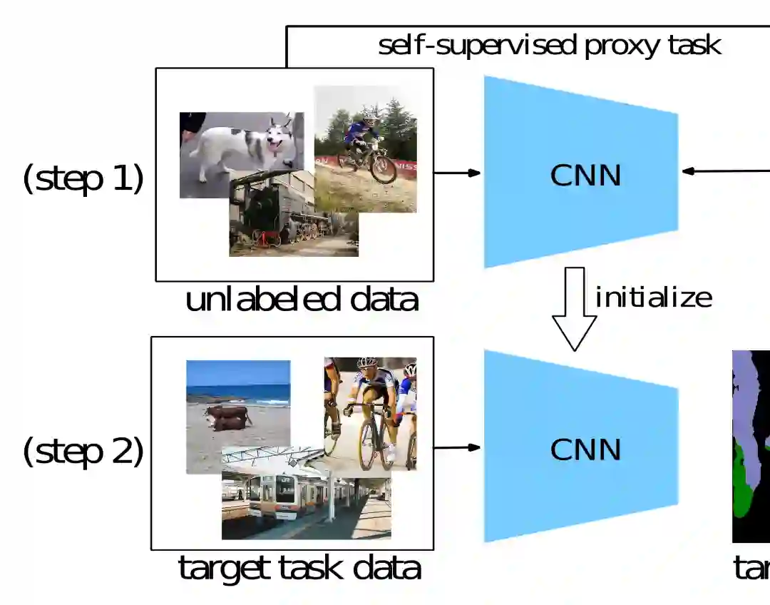 如下图,以自监督表征学习为例,我们通常需要设计一个自监督的proxy task,我们期望在解决这个proxy task的过程中,CNN能学到一些图像高级的语义信息。然后我们将训练好的CNN迁移到其他目标任务,例如图像语义分割、物体检测等等。