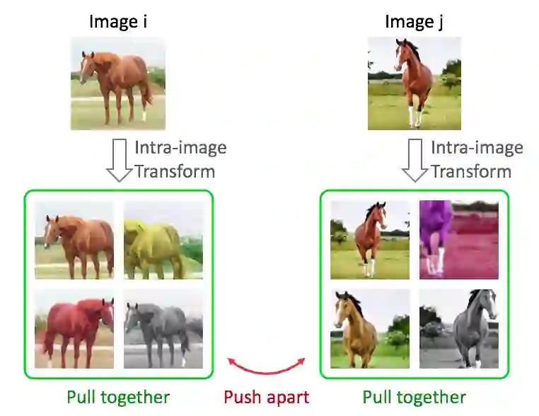 目前很火的基于contrastive learning的方法,我们可以将它们统一为instance discrimination任务。如下图,这类任务通常对图片做各种变换,然后优化目标是同一张图片的不同变换在特征空间中尽量接近,不同图片在特征空间中尽量远离。
