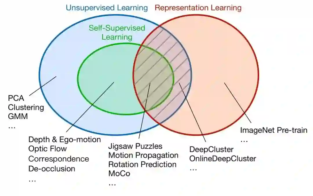 自监督学习是指用于机器学习的标注(ground truth)源于数据本身,而非来自人工标注。如下图,自监督学习首先属于无监督学习,因此其学习的目标无需人工标注。其次,目前的自监督学习领域可大致分为两个分支。
