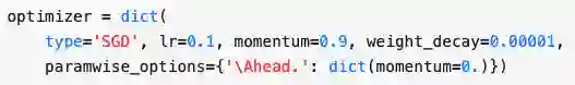 config中还支持一些较复杂的调整,比如data augmentation的组合、learning rate schedule、独立调整某些网络参数的优化参数等。例如,你希望单独调整head中fully-connected layer的momentum和learning rate,或者backbone中某几层的weight decay等等,可以在config中optimizer: paramwise_option下用正则表达式筛选出对应网络参数然后指定这些值,而不需要改动代码。如下是DeepCluster中指定head (fc layer)的momentum为0的设置。