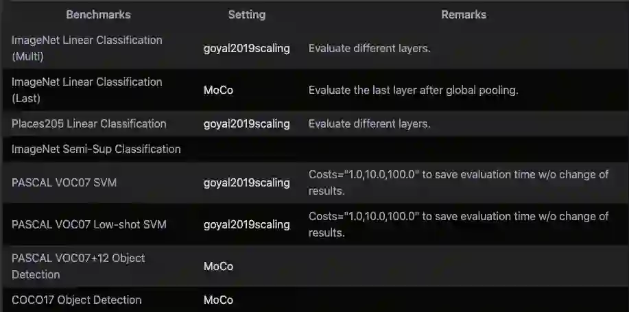 OpenSelfSup目前支持ImageNet/Place205 Linear Classification, ImageNet Semi-Supervised Classification, PASCAL VOC07 Linear SVM, PASCAL VOC / COCO Object Detection等多个标准的评测方案。
