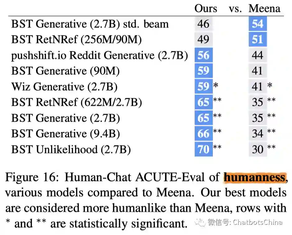 新的工作几乎不可能在 ACUTE-Eval 指标下胜过 Blender。相信接下来很多工作会发明很多新评估方法与 Blender PK;