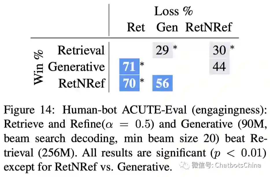 模型都还是用的最小模型,但 Generator 和 RetNRef 模型使用的 beam search 都加入了最小长度20的限制。结论反转了,Generator 和 RetNRef 显著优于 Retrieval。RetNRef 略优于 Generative,但不显著。(强烈怀疑 RetNRef 是作者夹带的私货,没有在此论文中存在的必要好不好!)