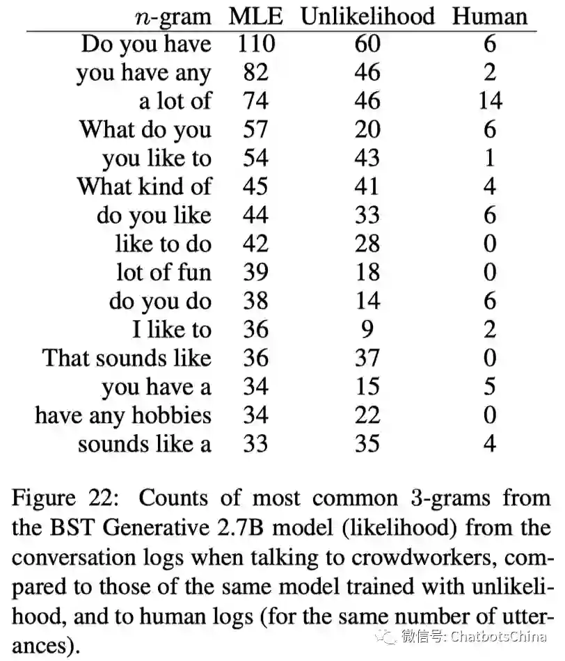 模型倾向于使用高频词,产生高频 n-grams,而很少使用低频词。虽然鼓励模型产生更长的回复会缓解这个问题,但无法杜绝。下图表明使用 unlikelihood loss 也可以缓解此问题。但使用unlikelihood loss 会降低 ACUTE-Evals 指标哦(作者很无奈,吹不了自己发明的 unlikelihood loss)。