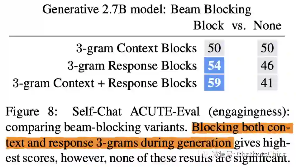 前面说过,decoding阶段一般使用Beam Search或Sampling方法。Meena的结论是sampling效果比beam search方法好,所以用了sampling方法。Blender则表示模型够好时beam search用好了不比sampling差,所以Blender使用了受限的beam search。Blender在beam search加入了以下限制:
