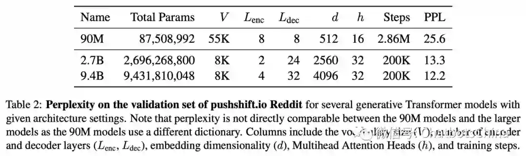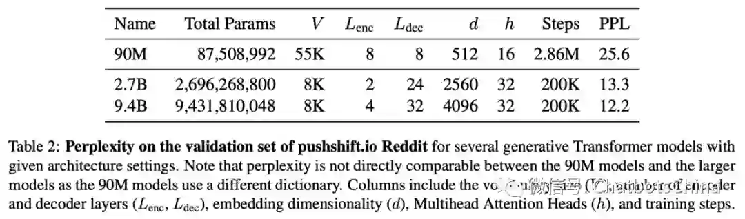 生成模型也是标准的 seq2seq 结构,只是用了标准的Transformer层,以及encoder层数少,decoder层数多的设计。下图列出了三个生成模型的尺寸,最大的模型包含了 9.4B 的参数量,快有 Meena 的 4 倍大了。