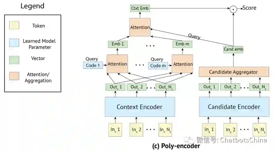 检索模型,顾名思义,就是从候选集中选取最合适的句子作为机器人当前的答复。具体打分/排序模型使用了作者在论文 “Poly-encoders: Transformer Architectures and Pre-training Strategies for Fast and Accurate Multi-sentence Scoring” 中提出的 Poly-encoder 模型,结构如下。可以把 poly-encoder 理解成对 Siamese 结构的一种改进。BERT中原始的打分方式是把context和response拼接起来一起送进BERT的,但这种做法非常耗时。作者认为 context 是由前面几轮对话拼接得到的,一般比response更长不少,所以 poly-encoder 中使用了 m 个向量对其进行表示。