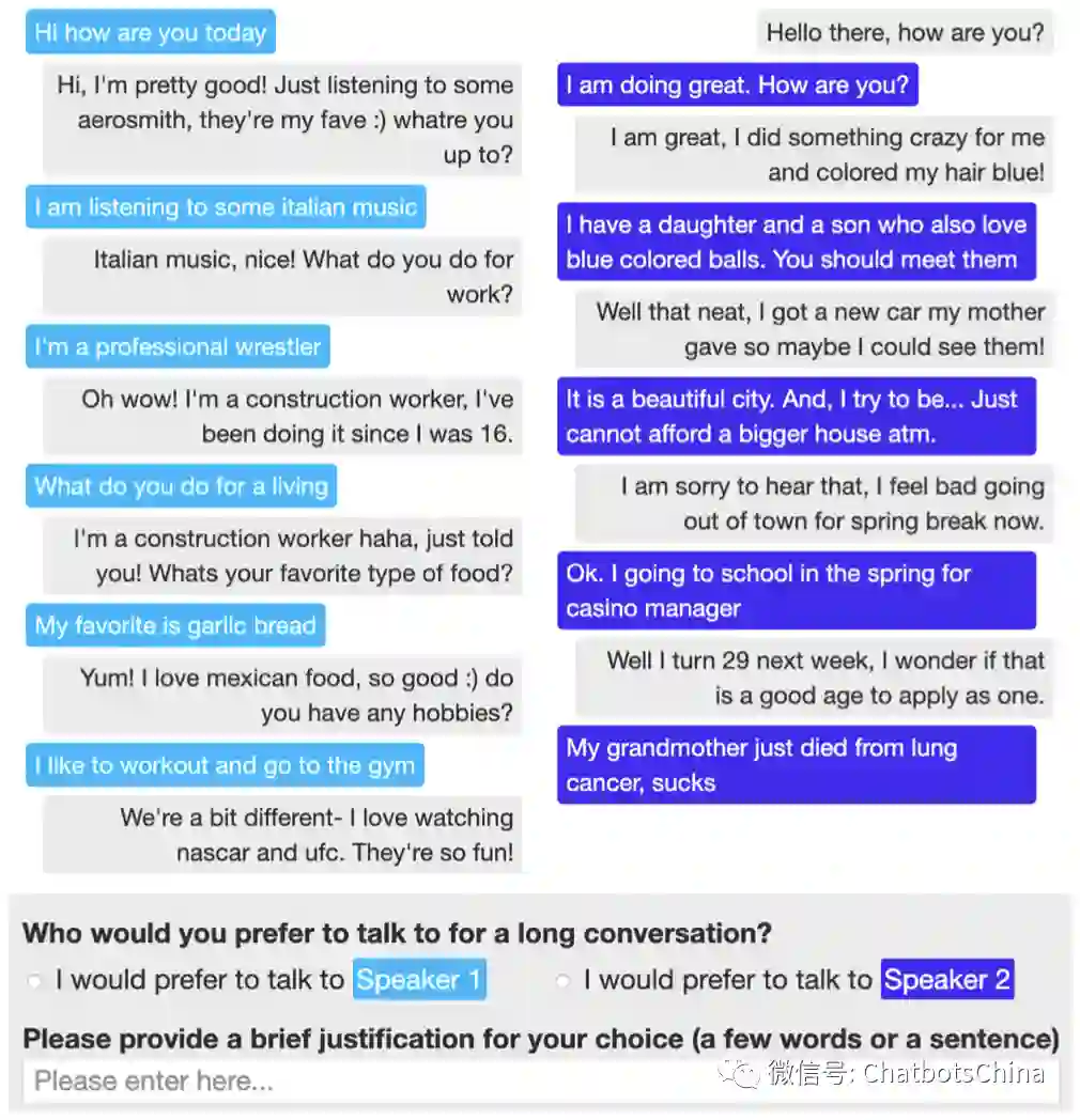 ACUTE-Eval 的做法是每次给两个对话session(每个session来自一个speaker与其他人的对话记录),然后让人来评判哪个 speaker 聊的更好(更想跟谁继续聊;谁更像人)。最后 ACUTE-Eval 可以给出两个 speaker 各自的胜率。下图是一个示例,左边是 speaker 1(浅蓝色)与其他人的对话记录,右边是 speaker 2(深蓝色)与其他人的对话记录。评委需要判断是左边的 speaker 1 聊得更好,还是右边的 speaker 2 聊得更好。