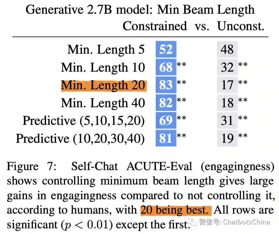 第一个结论是限制最小生成长度效果显著,最小长度限制设为20效果最好,其与不做限制时 PK 胜率达到了83%。