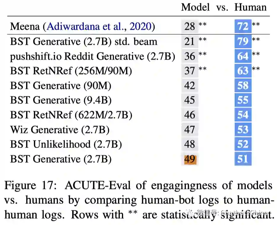 最后,Blender 到底跟人有多大差别呢?从 ACUTE-Eval 指标上看很接近了。Blender最好的模型(下图最后一行)和人 PK 的胜率已经到了 49%。和人的差距就剩 1% 了,已经是不显著的差距了。这个 1% 的差距留的实在太有深意了。新的工作几乎不可能用同样的评估方法 PK 掉 Blender 了。相信接下来很多工作会发明很多新评估方法与 Blender PK。