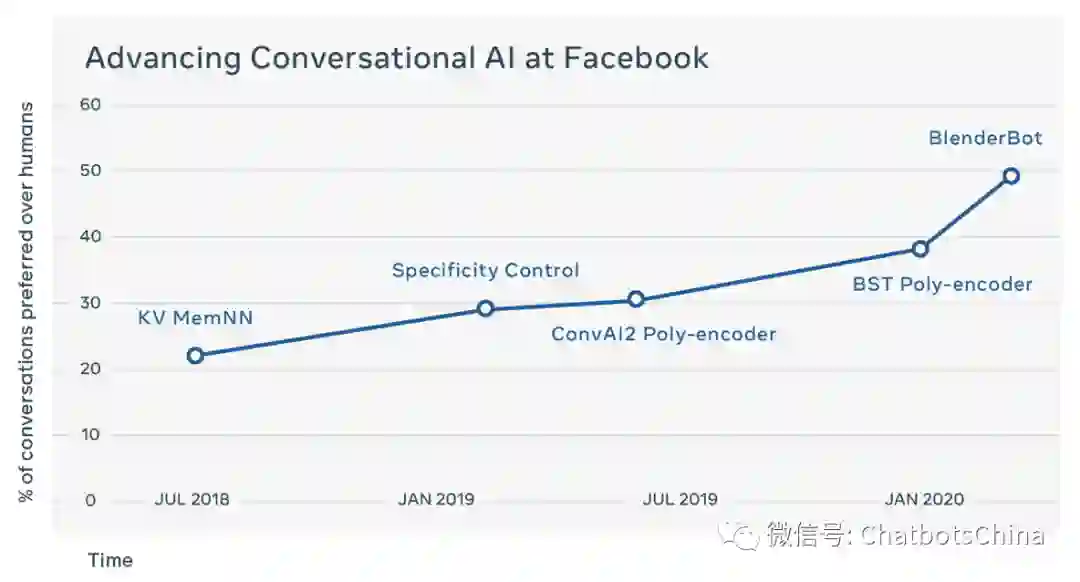 Blender这组人最近几年在开域聊天方向持续做了很多改进工作,他们的努力和信念还是挺让我感动的。Blender这个名字取得好,因为这篇论文基本是同一组人最近两年内很多相关工作的融合,个人觉得还是夹带了一些没必要放进来的私货的。下图可以看到他们提出的聊天机器人在不断逼近人类的水平(纵坐标是机器聊的比人好的百分比,所以人的聊天水平对应纵坐标50)。