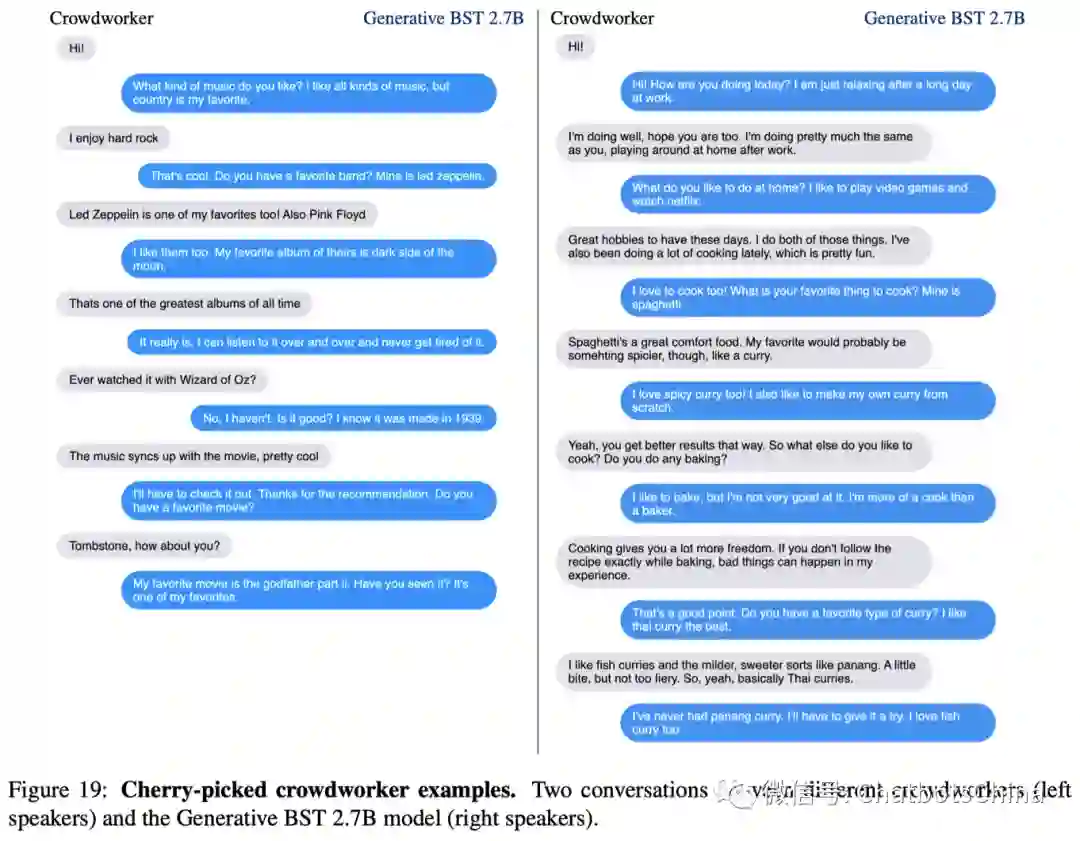 下图贴出了论文的几个正向示例,个人感觉对话内容确实比 Meena 丰富,可能是因为生成结果变长了吧。论文提供了很多示例,有兴趣可以仔细看看论文:“Recipes for building an open-domain chatbot” 。