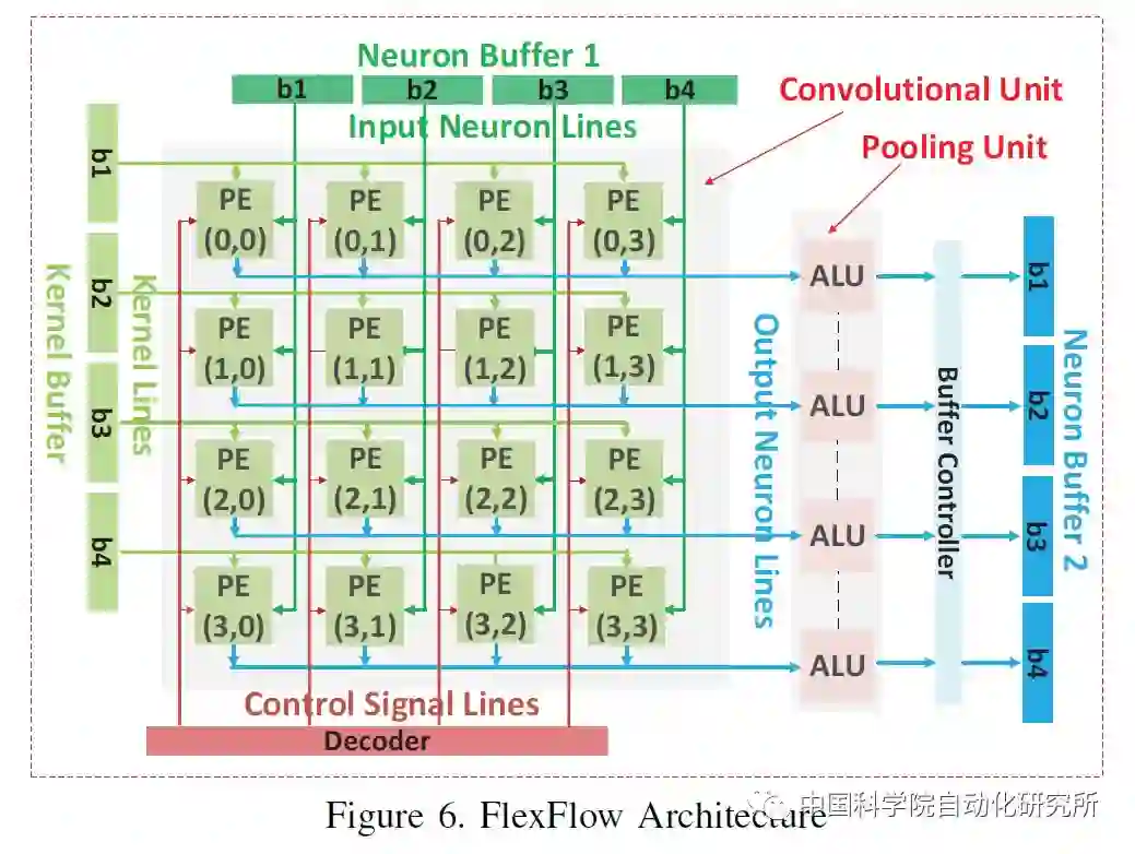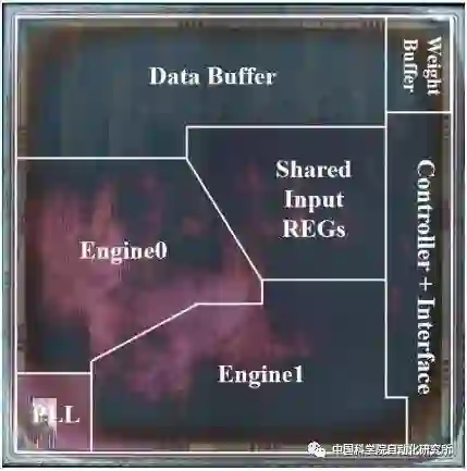 中国科学院计算机体系结构国家重点实验室在顶级会议HPCA2017上提出了一种基于数据流的神经网络处理器架构,以便适应特征图、神经元和突触等不同层级的并行计算,为了实现这一目标,该团队对单个处理单元PE进行重新设计,使得操作数可以直接通过横向或纵向的总线从片上存储器获取,而非传统PE只能从上至下或从左至右由相邻单元获取。该芯片采用了TMSC 65nm工艺,峰值性能为490.7 GOPs/W。