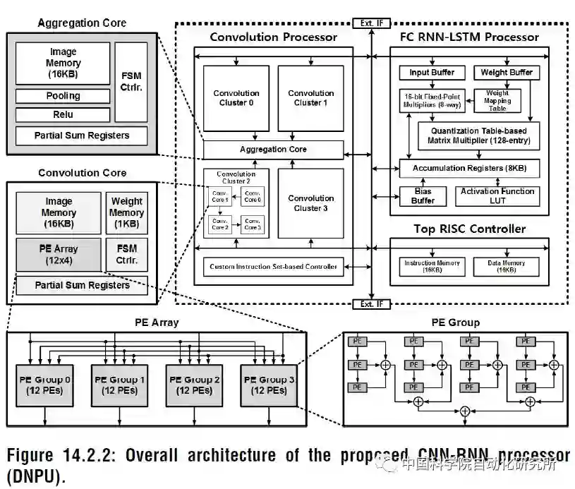 韩国科学技术院KAIST的Dongjoo Shin等人在ISSCC2017上提出了一个针对CNN和RNN结构可配置的加速器单元DNPU,除了包含一个RISC核之外,还包括了一个针对卷积层操作的计算阵列CP和一个针对全连接层RNN-LSTM操作的计算阵列FRP,相比于鲁汶大学的Envision,DNPU支持CNN和RNN结构,能效比高达8.1TOPS/W。该芯片采用了65nm CMOS工艺。