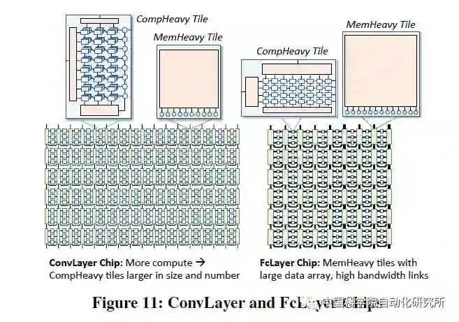 该论文针对深度神经网络的训练部分进行针对性优化,提出了一个可扩展服务器架构,且深入分析了深度神经网络中卷积层,采样层,全连接层等在计算密集度和访存密集度方面的不同,设计了两种处理器core架构,计算密集型的任务放在了comHeavy核中,包含大量的2D乘法器和累加器部件,而对于访存密集型任务则放在了memHeavy核中,包含大量SPM存储器和tracker同步单元,既可以作为存储单元使用,又可以进行计算操作,包括ReLU,tanh等。而一个SCALEDEEP Chip则可以有不同配置下的两类处理器核组成,然后再组成计算簇。